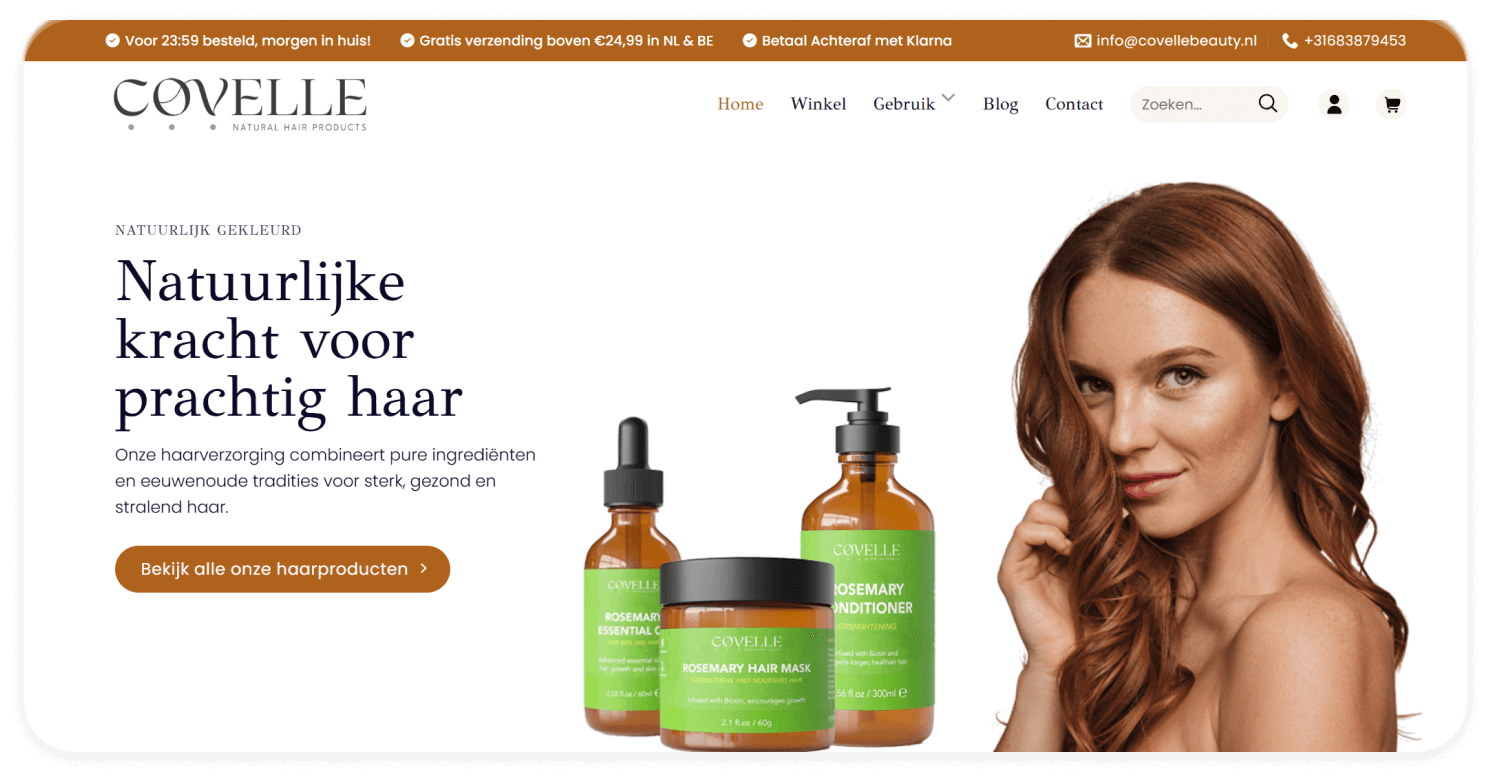 Wij hebben een WooCommerce-webshop voor Covelle Beauty ontwikkeld, volledig volgens het aangeleverde design. De webshop draait op onze dedicated server voor razendsnelle en stabiele hosting, wat zorgt voor een optimale gebruikerservaring. Daarnaast hebben we RankMath SEO geïmplementeerd om belangrijke pagina’s en de blog beter te laten presteren in Google. Om het bereik verder te vergroten, is de webshop uitgebreid met een affiliateprogramma voor partners en influencers.